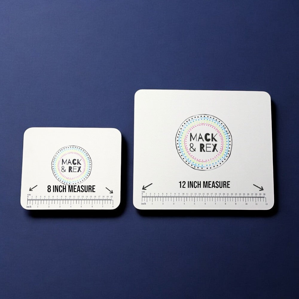 9 x 7.5 inch non-slip bead mat with built-in ruler.  Our Mack & Rex bead mat was made to endure some dirt & use and can be washed with a wet rag! It comes in two sizes