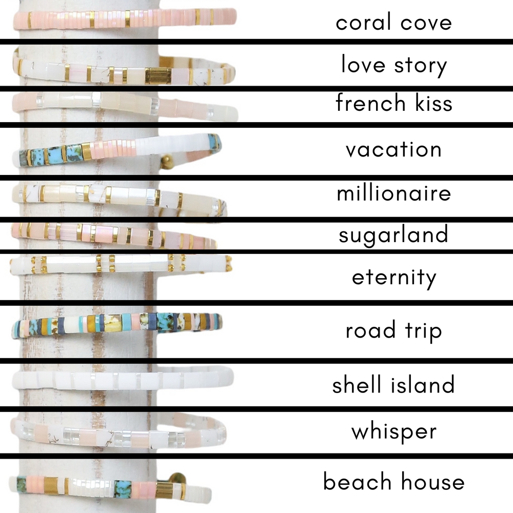Tila Bracelets by Mack & Rex are NOT your typical beaded bracelets! We proudly back up our bracelets with a quality guarantee (yes, on stretchy bracelets!) and know that you will love them! They are made with an expensive crystal cord elastic, as well as glass tile beads from the top manufacture in Japan. In addition to being beautiful, our stretchy bead bracelets are:
