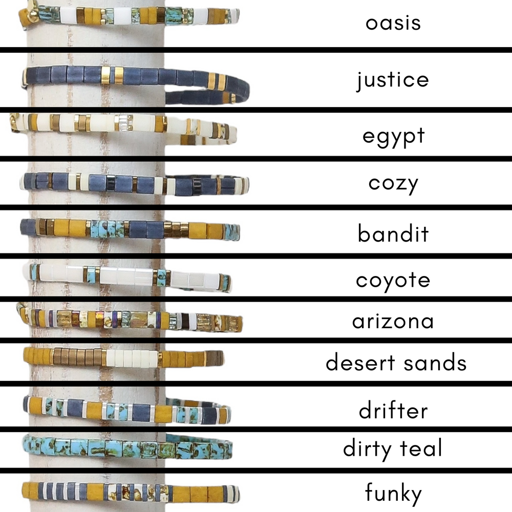 Tila Bracelets by Mack & Rex are NOT your typical beaded bracelets! We proudly back up our bracelets with a quality guarantee (yes, on stretchy bracelets!) and know that you will love them! They are made with an expensive crystal cord elastic, as well as glass tile beads from the top manufacture in Japan. In addition to being beautiful, our stretchy bead bracelets are: