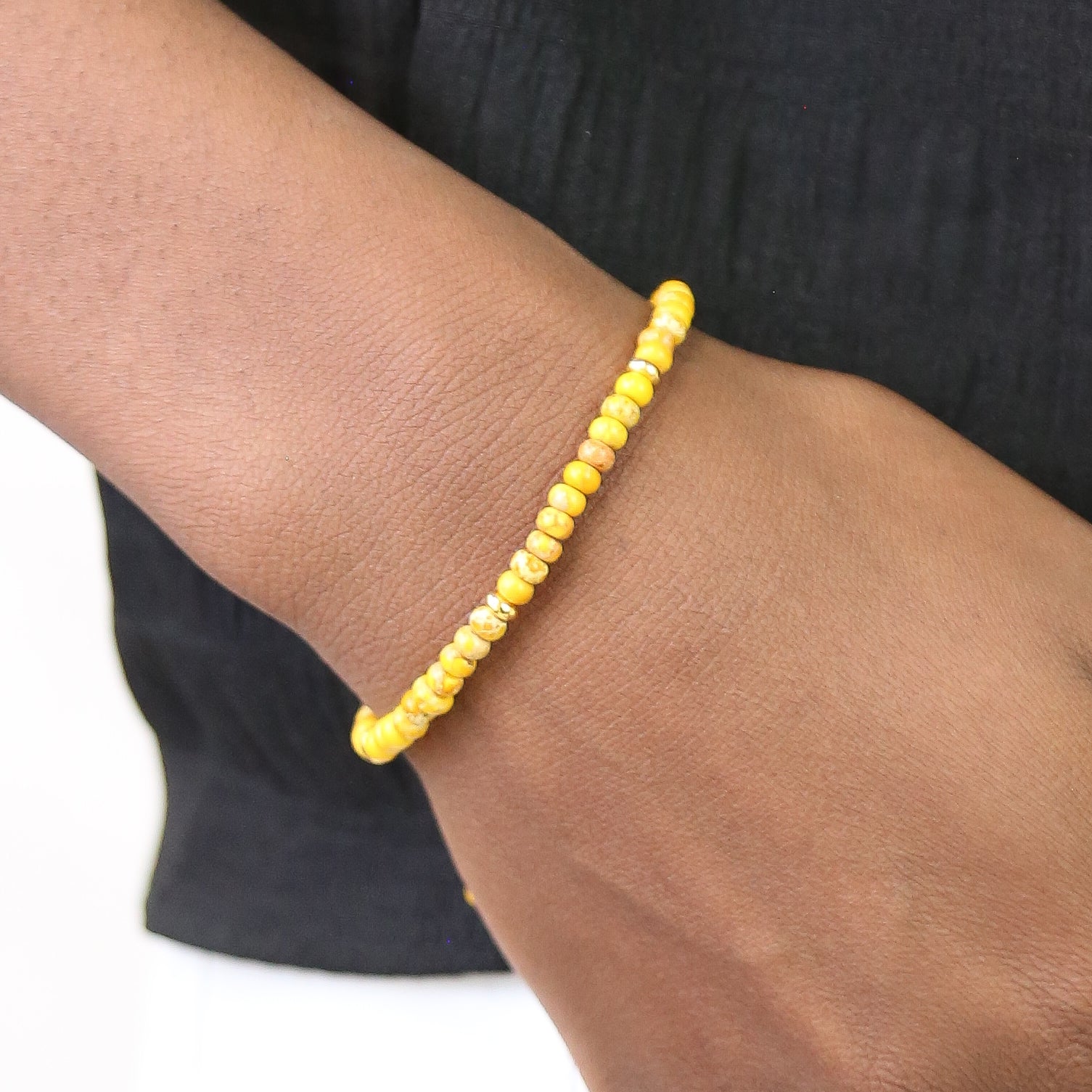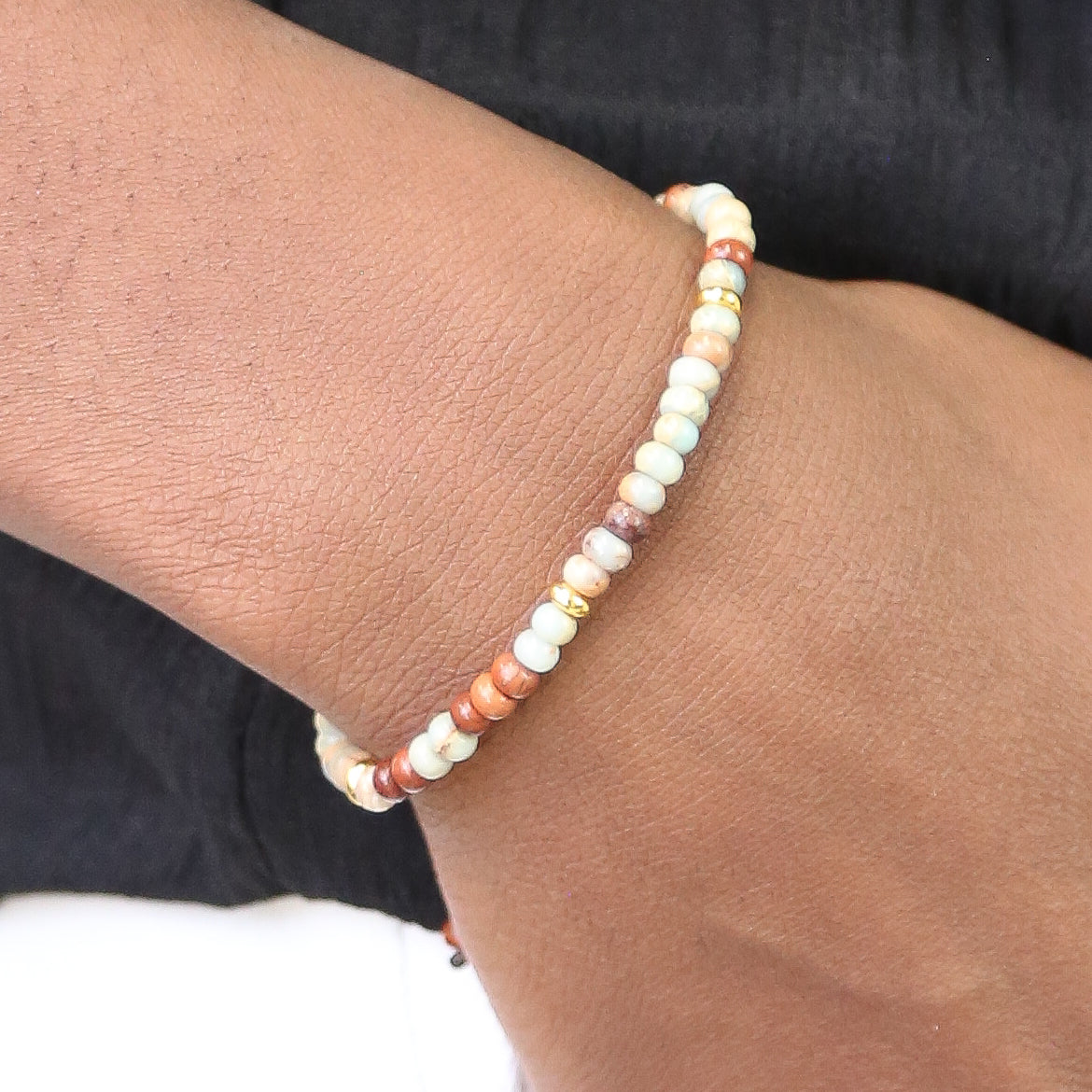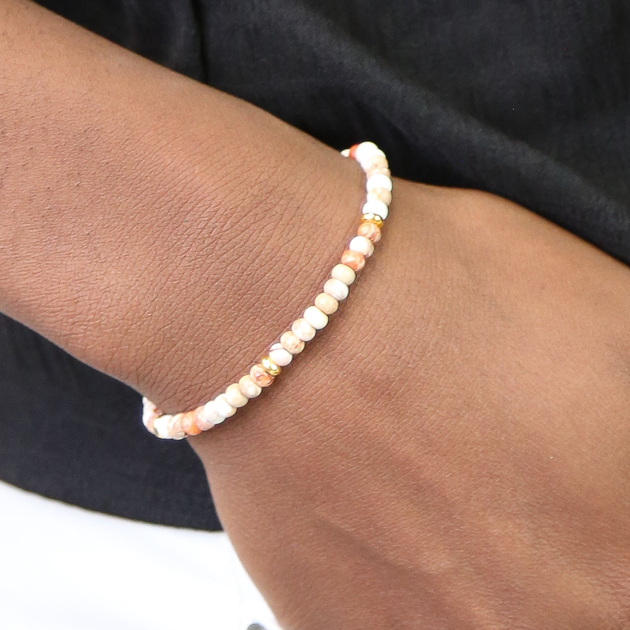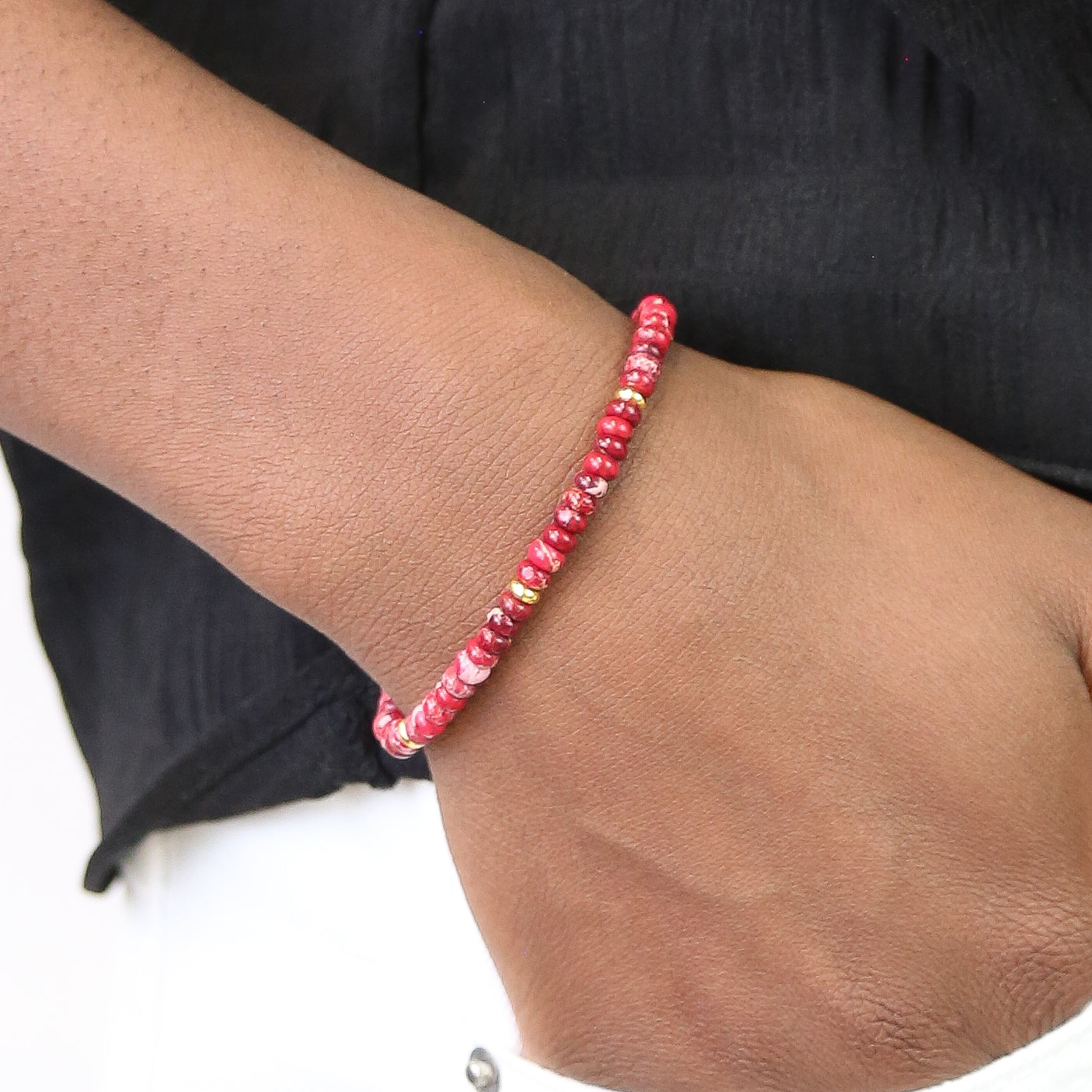 This stunning accent bracelet known as 'Stoned Oval' in multiple different colors, is made of high quality stone beads. With adjustable sizing, its perfect for anyone and everyone! Gold beads separating the stones add a gorgeous touch! Add it to your bracelet collection or become the favorite gift giver this holiday season!